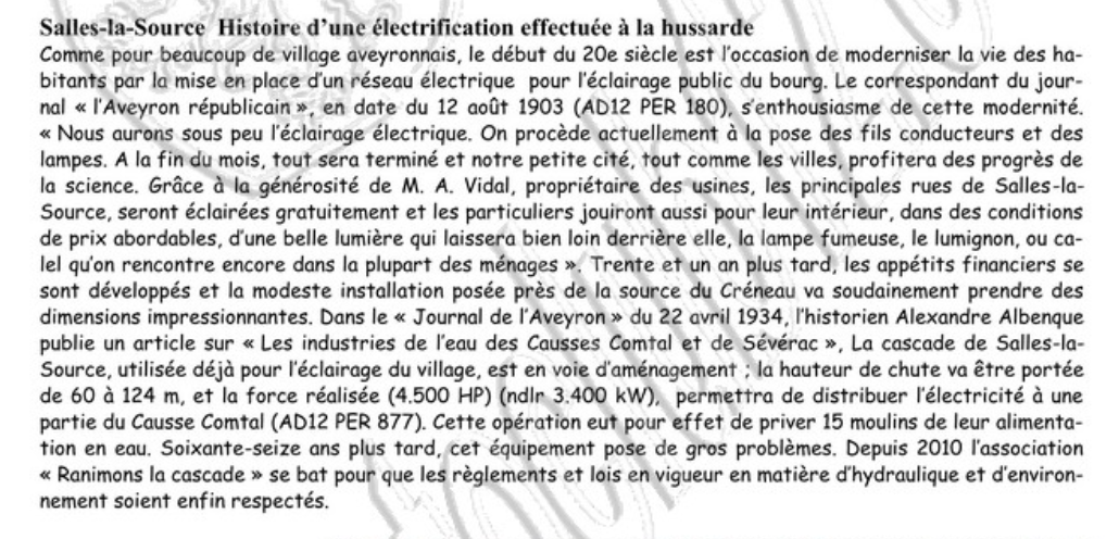 Dans un de ses bulletins, datant de 2010, le Carto-Club aveyronnais s’intéresse à l’arrivée de l’électricité en Aveyron. Salles-la-Source y est cité.